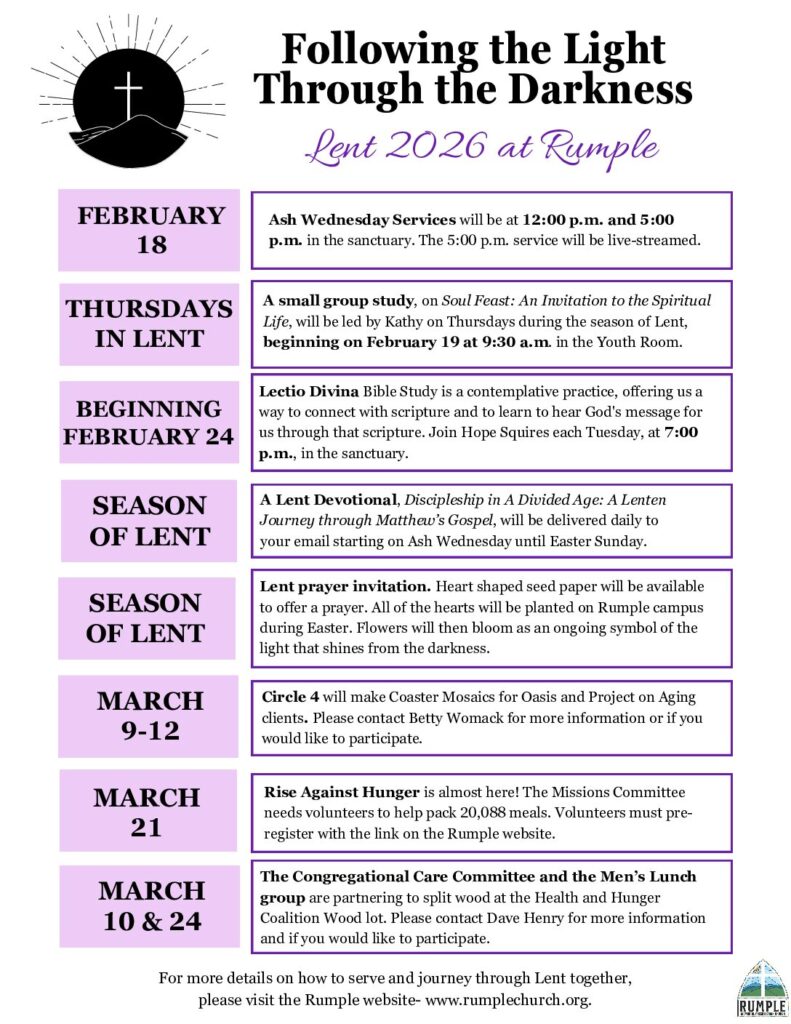 Join us this Lent as we journey together through learning, missions, and community. Find more details on our event page or contact the church office.